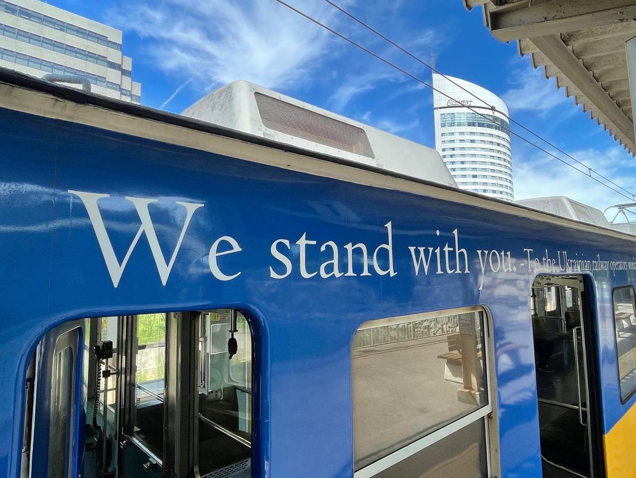 "Желто-голубой" поезд с надписью "Мы с вами" курсирует в знак уважения и солидарности с украинскими железнодорожниками.