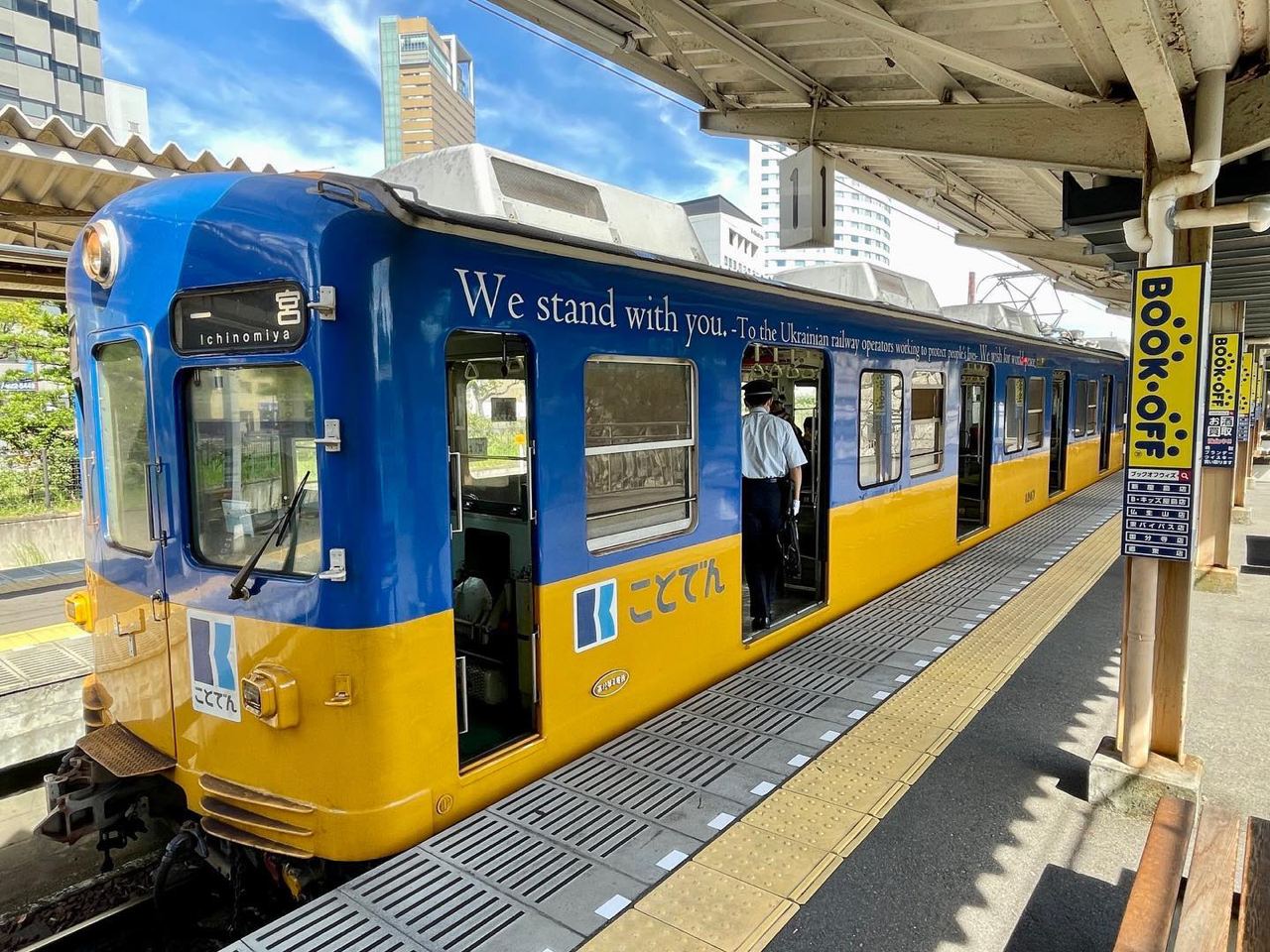 Компания Takamatsu-Kotohira Electric Railroad Co также разместила ящики для пожертвований в поддержку Украины на четырех станциях вдоль линии.