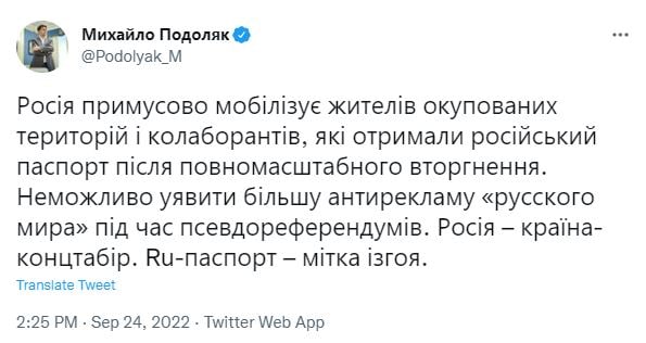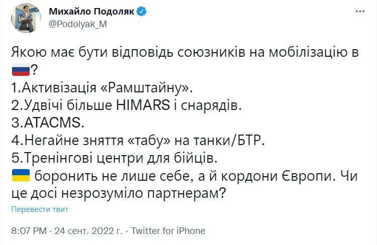 22:43 Советник главы ОПУ Подоляк напомнил союзникам, как они должны реагировать на так называемые "референдумы" россии: еще больше оружия. Он снова подчеркнул, что Украина защищает не только себя, но и всю Европу.