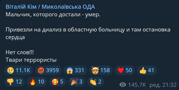 21:59 В Николаеве скончался 11-летний мальчик. Он находился шесть часов под завалами после обстрела, а умер от остановки сердца. Об этом сообщил глава Николаевской ОГА Виталий Ким.