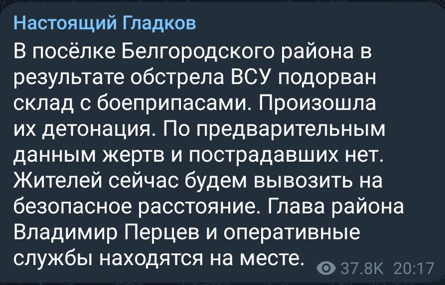 20:31 Губернатор Белгородской области Вячеслав Гладков обвинил Вооруженные силы Украины в ударе по складу с боеприпасами. При этом он отметил, что жертв и пострадавших нет.