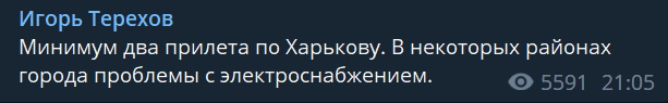 21:08 В Харькове звучат взрывы. Мэр Игорь Терехов сообщил о перебоях с электричеством.