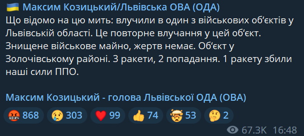 17:03 Оккупанты попали в военный объект во Львовской области, жертв нет - глава ОГА Максим Козицкий.