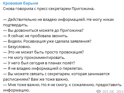 Российская пропагандистка Ксения Собчак в Telegram сообщила, что разговаривала с пресс-секретарем Пригожина, который не смог подтвердить, действительно ли в самолете находился главарь ЧВК "Вагнер".