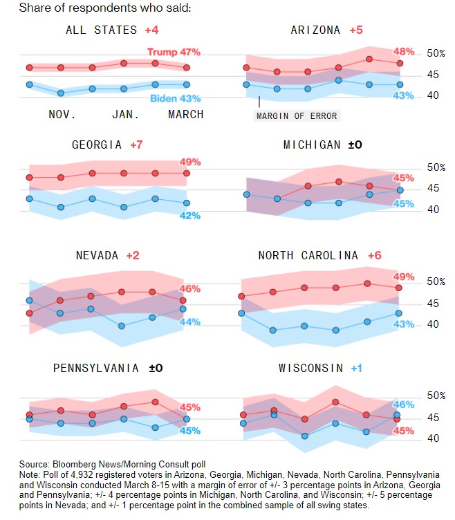 Согласно опросу общественного мнения, ежемесячно проводимому Bloomberg News и Morning Consult, рейтинг Байдена вырос в шести из семи штатов. Эти результаты свидетельствуют о значительном улучшении позиций Байдена.
