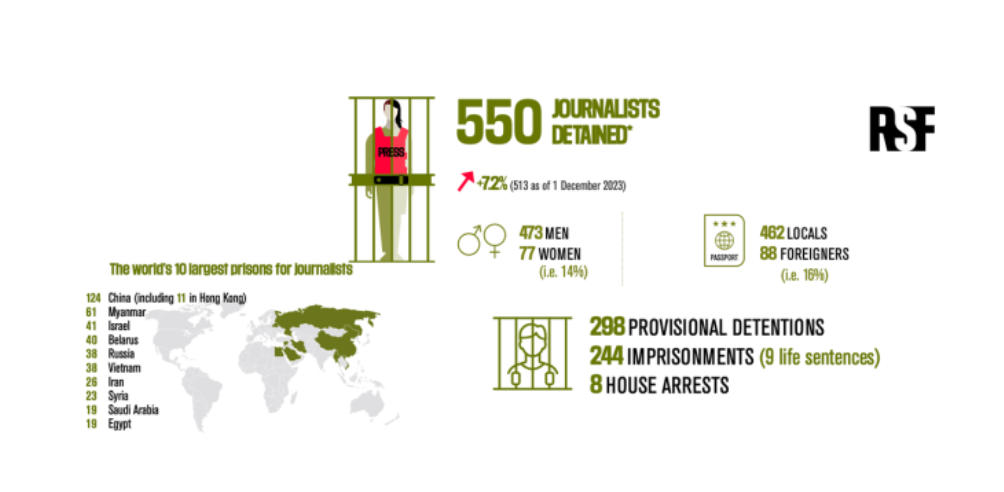 Общее количество задержанных журналистов в мире составило 550 против 513 в 2023-м.