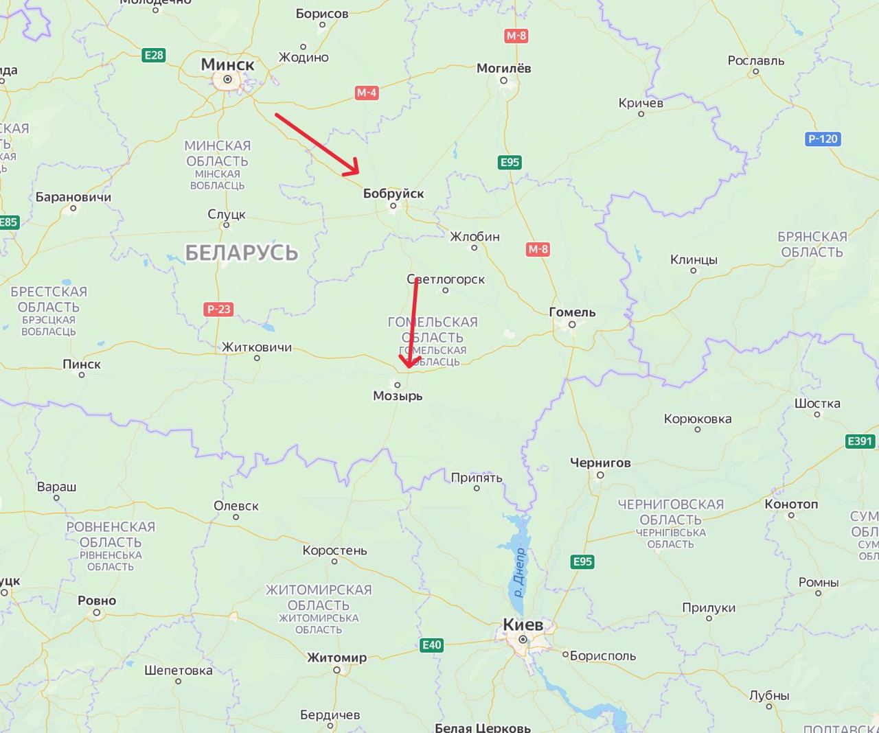 Кроме того, в 10:45 похожую колонну заметили уже на трассе Р-31 в направлении Мозыря, что в 46 километрах от границы с Украиной.