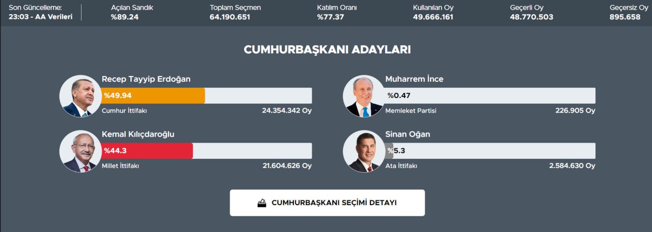 По состоянию на 23:20 Эрдоган набирает 49,94%, его соперник Кемаль Киличдароглу получил 44,3%, сокращая разрыв. За Синана Огана голоса отдало 5,3% турков, Мухаррема Индже – всего 0,47%. На это время удалось обработать уже 89,24% бюллетеней.