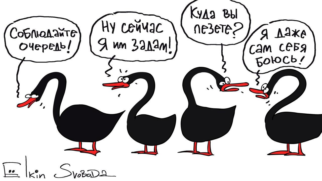 В частности, карикатурист изобразил ожидание непредсказуемых факторов, так называемых "черных лебедей", которые могут радикально повлиять на рынок.