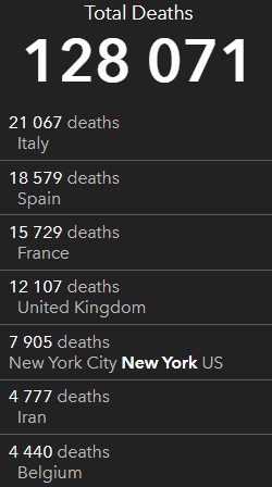 За время пандемии, коронавирус убил 128 071 человека. Больше всего людей умерло в Италии (21 067), Испании (18 579) и Франции (15 729).