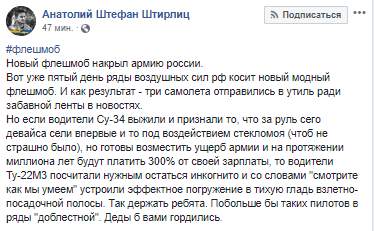 "Новый флешмоб накрыл армию России. Вот уже пятый день ряды воздушных сил рф косит новый модный флешмоб. И как результат - три самолета отправились в утиль ради забавной ленты в новостях. Но если водители Су-34 выжили и признали то, что за руль сего девайса сели впервые и то под воздействием стекломоя (чтоб не страшно было), но готовы возместить ущерб армии и на протяжении миллиона лет будут платить 300% от своей зарплаты, то водители Ту-22М3 посчитали нужным остаться инкогнито и со словами "смотрите как мы умеем" устроили эффектное погружение в тихую гладь взлетно-посадочной полосы. Так держать ребята. Побольше бы таких пилотов в ряды "доблестной". Деды б вами гордились", - написал он.