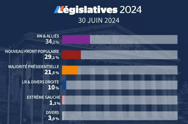 На внеочередных парламентских выборах во Франции побеждает ультраправая партия "Национальное объединение" – за нее проголосовали 34,2% французов.