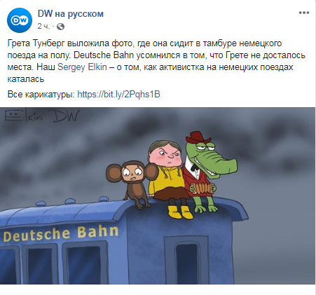 DB в своем микроблоге поблагодарил девушку за "поддержку в борьбе с изменением климата" и выбор скоростного поезда ICE 74, отметив, что тот потребляет электроэнергию только из возобновляемых источников. Вместе с тем, говорится далее в твите, "было бы еще лучше", если бы Грета Тунберг рассказала о том, насколько компетентной и дружелюбной была команда, обслуживавшая ее в вагоне первого класса.