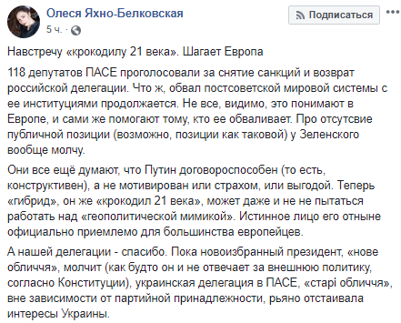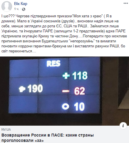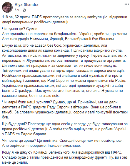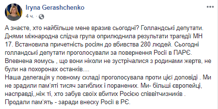 "А знаете, кто больше всего меня поразил сегодня? Голландские депутаты. На днях международная следственная группа обнародовала результаты трагедии МН 17. Установить причастность россиян к убийству 280 человек. Сегодня голландские депутаты проголосовали за возвращение России в ПАСЕ. Уверена почему-то, что они никогда не встречались с семьями жертв, не были на похоронах останков... ", - написала в Facebook первый вице-спикер ВР и член украинской делегации Ирина Геращенко.