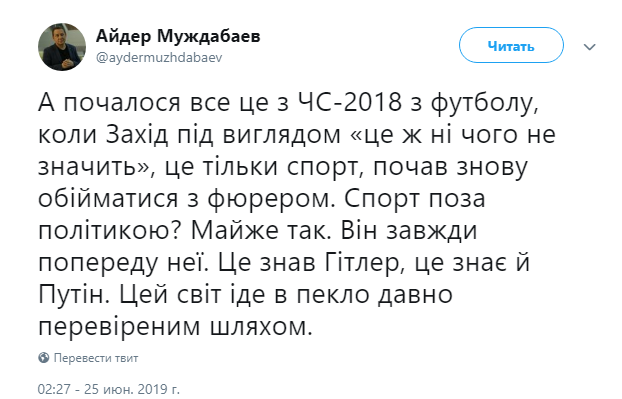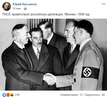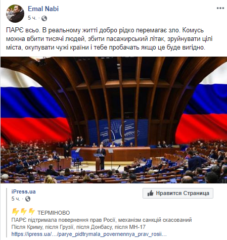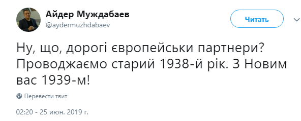 "Ну, что, дорогие европейски партнеры? Провожаем старый 1938-й год. С Новым вас 1939 м!", - прокомментировал решение ПАСЕ в Twitter журналист, медиаменеджер, заместитель гендиректора крымско-татарськго телеканала ATR Айдер Муджабаев.