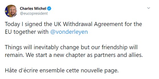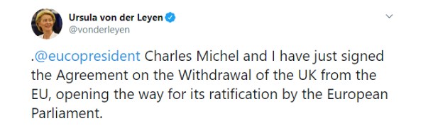 "Сегодня мы с Урсулой фон дер Ляйен подписали соглашение о выходе Великобритании", - написал Шарль Мишель.