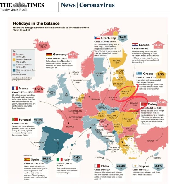 Также британские журналисты отметили заметное снижение заболеваемости в Испании - на 60,1%, также в Португалии число заражений снизилось на 21,8%, а на Мальте - на 20,2%.