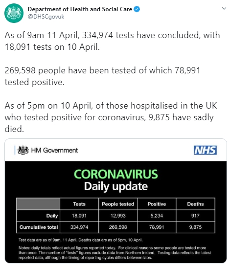 По состоянию на 9 часов утра 11 апреля тесты на коронавирус сдали 334 974 британцев.