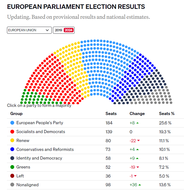 Politico сообщает, что правящая партия Венгрии "Фидес" на этот раз может получить худший результат на выборах в Европарламент - "Фидес" премьер-министра Виктора Орбана набрала 44,6%, что является ниже ранее прогнозируемого показателя. Вместе с этим партия оппонента - оппозиционная партия "Уважение и свобода" (TISZA) Петера Мадьяра - набрала 30,1%. Следовательно отмечается, что Орбан получит в новом парламенте 11 мест, а его оппонент с партией "Уважение и свобода" - 7 мандатов.