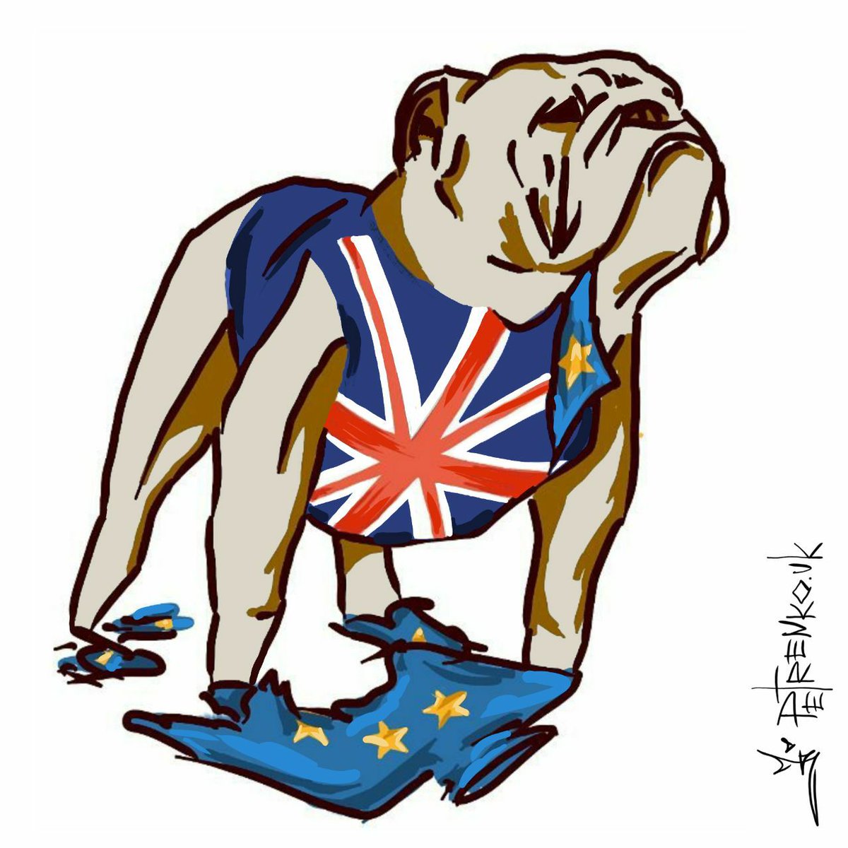На рисунке бульдог с британским флагом на груди разрывает, как тряпку, флаг Евросоюза, демонстрируя твердое намерение Великобритании разорвать связи с ЕС.