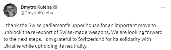 "Я благодарю верхнюю палату парламента Швейцарии за важный шаг по разблокированию реэкспорта швейцарского оружия. Мы с нетерпением ждем следующих шагов. Я благодарен Швейцарии за солидарность с Украиной, при сохранении ее нейтралитета", – написал министр иностранных дел Кулеба.