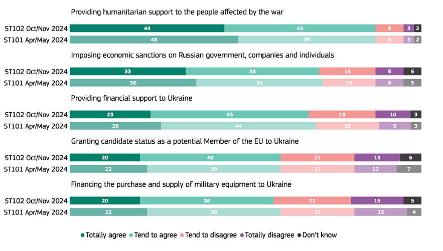 71% граждан ЕС поддерживают экономические санкции против российского правительства, компаний и физических лиц и 68% согласны с предоставлением финансовой поддержки Украине. 60% одобряют предоставление Украине статуса кандидата ЕС. 58% согласны с финансированием ЕС закупки и поставки военной техники для Украины.