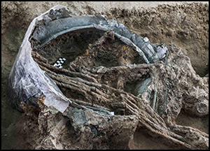 В могиле нашли около ста керамических сосудов, бронзовый шлем и колесницу на железных колесах. К сожалению, останки самого военачальника до нашего времени не сохранились.