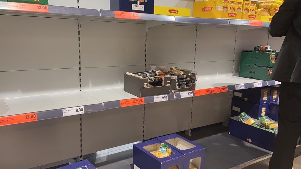 Как свидетельствуют опубликованные фото, прилавки супермаркетов в чешской столице опустели, люди активно закупаются продуктами.