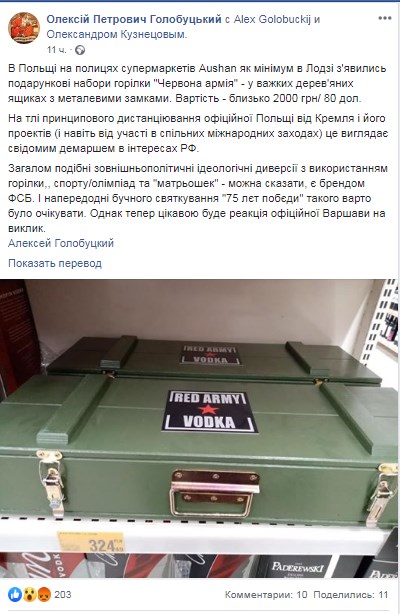 "В целом подобные внешнеполитические идеологические диверсии с использованием водки, спорта, олимпиад и "матрьошек" - можно сказать, является брендом ФСБ. И накануне шумного празднования "75 Лет победы" такого стоило ожидать. Однако теперь интересной будет реакция официальной Варшавы на вызов", - добавил Голобуцкий.
