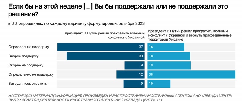 Семдесят процентов россиян готовы поддержать своего президента Владимира Путина, если он решит прекратить войну против Украины. Однако не в случае возвращения оккупированных территорий.