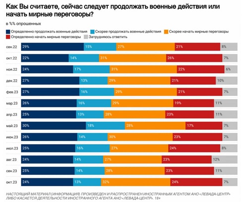 В то же время, 55% опрошенных граждан РФ считают, что следует прекращать войну и начинать мирные переговоры. 38% выступают за продолжение военных действий.