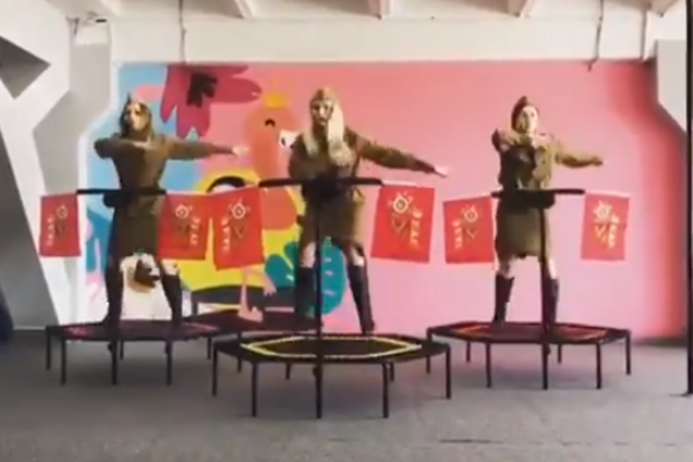 Еще где-то в России три девушки, переодетые в советскую военную форму, решили, что прыжки на батутах с оружием – это отличный вариант отпраздновать День победы над нацизмом во Второй мировой войне.