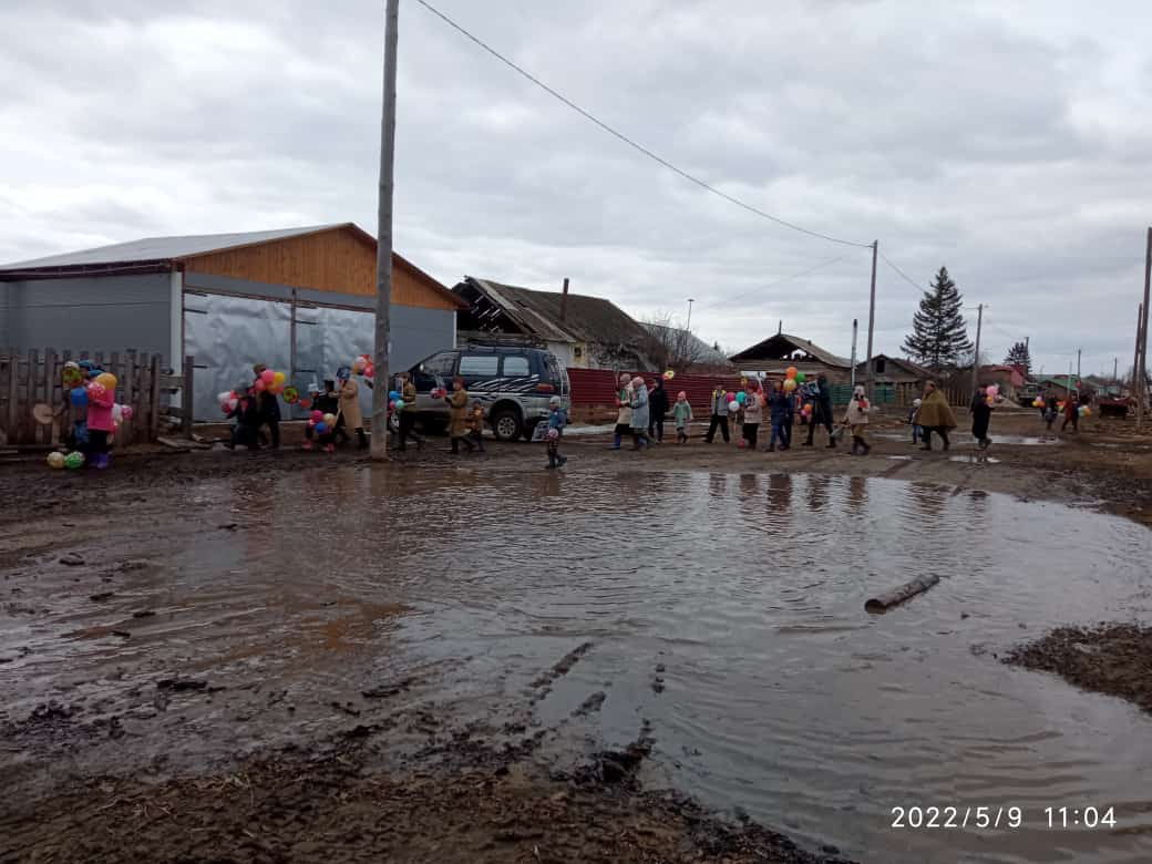 В одном российском то ли городе, то ли деревне начали воспевать величие страны-террориста России, проходя мимо огромной лужи, которая уже превратилась в грязевое болото.
