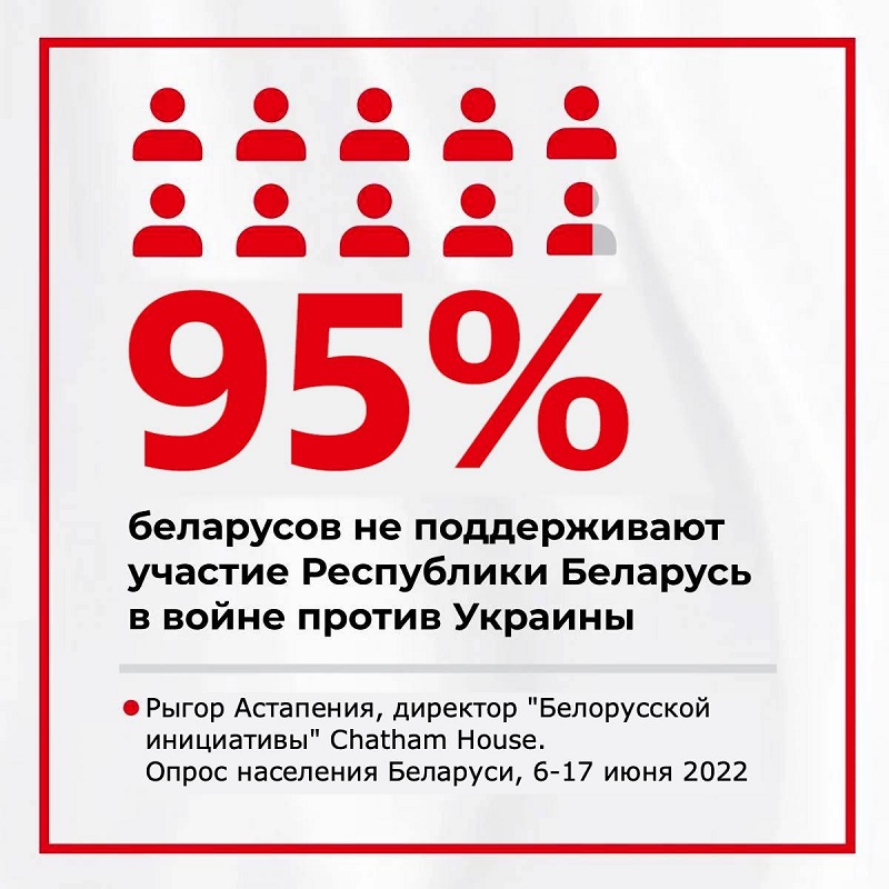 "Отношение беларусов к войне россии в Украине остается отрицательным. Мы видим, что постепенно происходит плавление поддержки россии. Уменьшается количество людей, которые считают, что нужно поддерживать действия россии (с 28% в марте до 23% в июне 2022 года). А людей, которые считают, что Беларусь должна принять участие в военных действиях на стороне россии, немного – 5%", - говорит Рыгор Астапеня, директор "Беларусской инициативы" Chatham House.