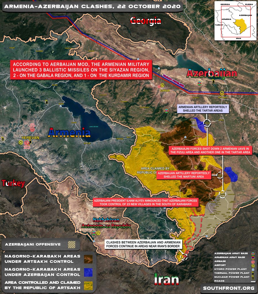 Несмотря на объявленное гуманитарное перемирие, между Азербайджаном и Арменией с 27 сентября продолжаются бои за Нагорный Карабах. Президент Азербайджана Ильхам Алиев объявил, что азербайджанские силы взяли под свой контроль 23 новых села на юге Карабаха.