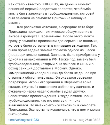 "Якобы его уронили в Шереметьево на складе. "Мутный" поставщик забрал эту запчасть и буквально через неделю якобы выдал другую, непонятного происхождения. Откуда взялся новый турбохолодильник, кто его поставил - пока выясняется. Но, именно его и установили в самолете Пригожина. Эксперты не исключают, что в нем и могла быть бомба", - указано в сообщении.