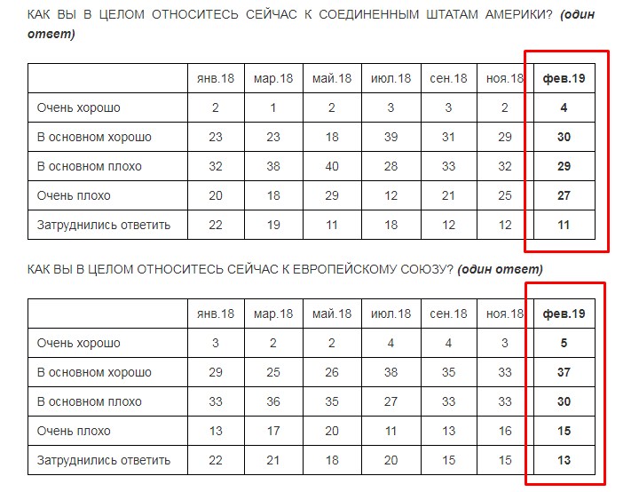 Отношение россиян к Европейскому Союзу и США по сравнению с концом 2018 года также несколько улучшилось. Доля недовольных ЕС уменьшилась с 49% до 45%. США - с 57% до 56%. Положительно к Брюсселю и Вашингтону относятся 42% и 34% россиян соответственно.