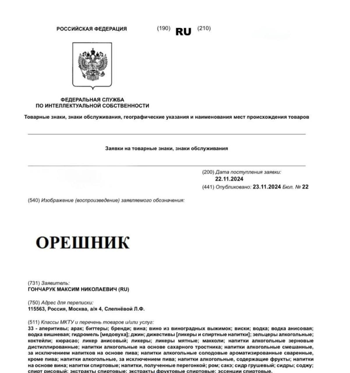 Под товарным знаком "Орешние" планируется производить и продавать алкогольные напитки, в том числе водку, вино, виски, медовуху, бренди, ром и сидр. Заявку на регистрацию бренда подал Максим Гончарук, род его деятельности не уточняется.