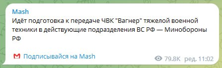 Тем временем у Шойгу заявили, что ведут подготовку к передаче тяжелой военной техники ЧВК "Вагнер" регулярным подразделениям армии РФ.