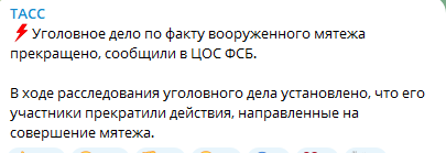В ФСБ объяснили прекращение преследования мятежников тем, что "участники прекратили действия, непосредственно направленные на совершение преступления".
