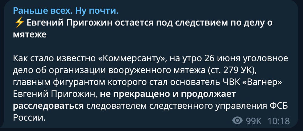 Однако спустя почти двое суток стало известно, что дело против Евгения Пригожина не закрыто, поэтому можно сделать вывод, что Кремль проигнорировал и другие требования террориста.