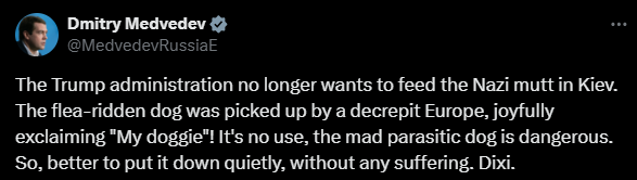 Медведев в присущем ему стиле назвал украинцев нацистами, а Европу, которая помогает Украине, дряхлой.