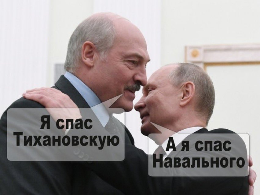 Путина и Лукашенко изобразили героями-спасителями. Лукашенко говорит Путину: "Я спас Тихановскую", а тот ему отвечает: "А я спас Навального".