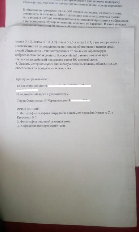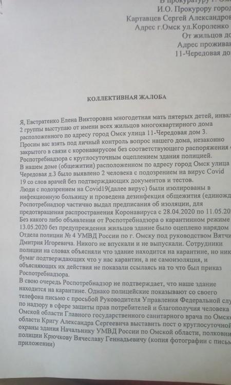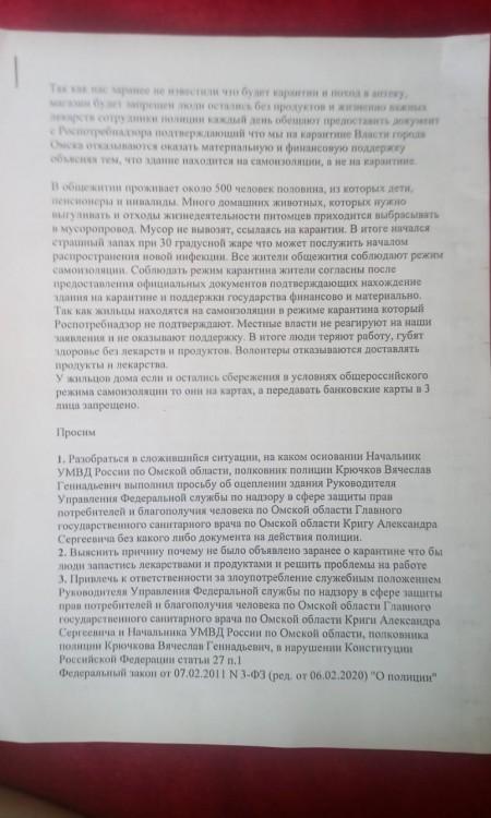 Женщина выступила от имени всех жильцов дома, составив коллективное обращение к президенту РФ, а также к губернатору и прокурору Омской области. В обращении люди попросили чиновников обратить внимание на их проблему и помочь с обеспечением жильцов едой и лекарствами. Под обращением подписались более 400 человек.