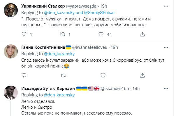"Мужчина силой мысли заставил тромб оторваться", "Повезло мужику - инсульт! Дома помрет, с руками, ногами и пи***ом", - завистливо шептались другие мобилизованные", "Легко и быстро отделался. Остальные пока не понимают, насколько ему повезло", "А десять лет за откос от службы дадут кому-нибудь из родственников, чтобы все знали, что инсульт в армии запрещен", - комментируют случай пользователи.