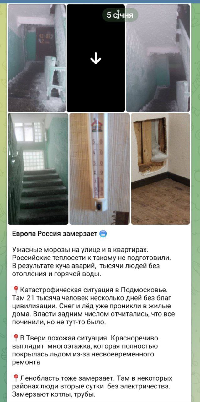 Российские медиа называют ситуацию в Подмосковье катастрофической. Отсутствие отопления и сильные морозы привели к тому, что подъезды жилых многоквартирных домов замело снегом, а на окнах появились слои льда.