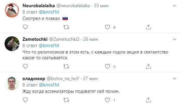"Маразм крепчал. Герои войны на том свете переворачиваются бедные... Это ж надо так глумится над памятью погибших", "Что-то религиозное в этом есть, с каждым годом акция в сектантство какое-то скатывается", "А ведь кто-то думал, думал и придумал", - пишут они.
