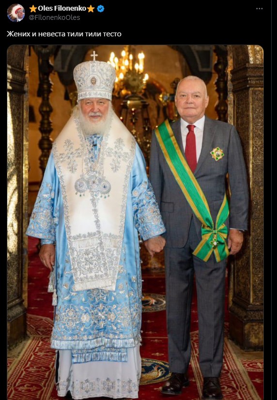 Глава РПЦ Кирилл Гундяев вручил российскому пропагандисту Дмитрию Киселеву орден Сергия Радонежского I степени. Церемония состоялась в Успенском соборе Кремля.