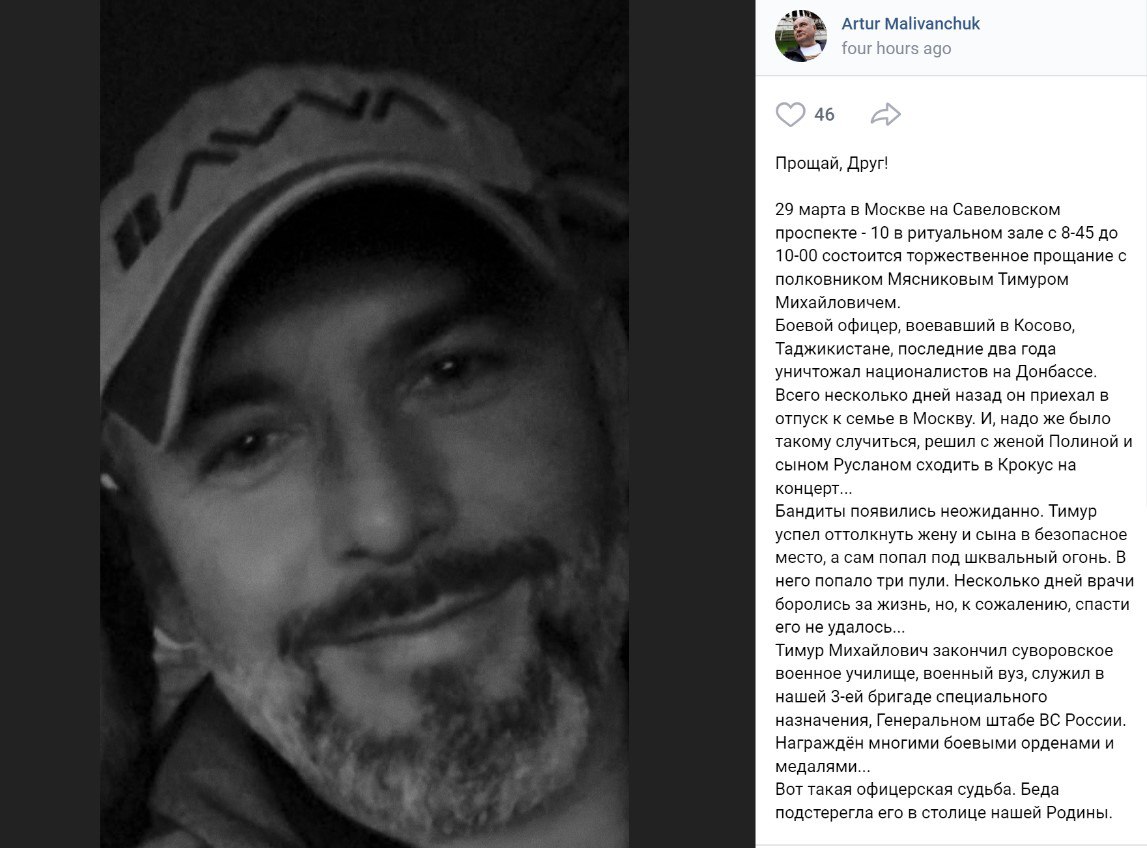 После ранения, полученного во время теракта в московском "Крокус Сити Холле", умер полковник ГРУ Тимур Мясников – он только недавно вернулся из Украины.