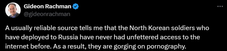 "Северокорейские солдаты, дислоцировавшиеся в России, никогда раньше не имели беспрепятственного доступа к Интернету. В результате они подсели на порнографию", - написал он.